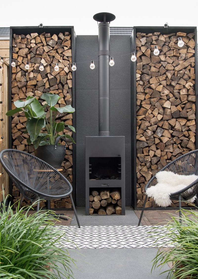 En annen måte å style uteplassen med vedstablet vegg er slik